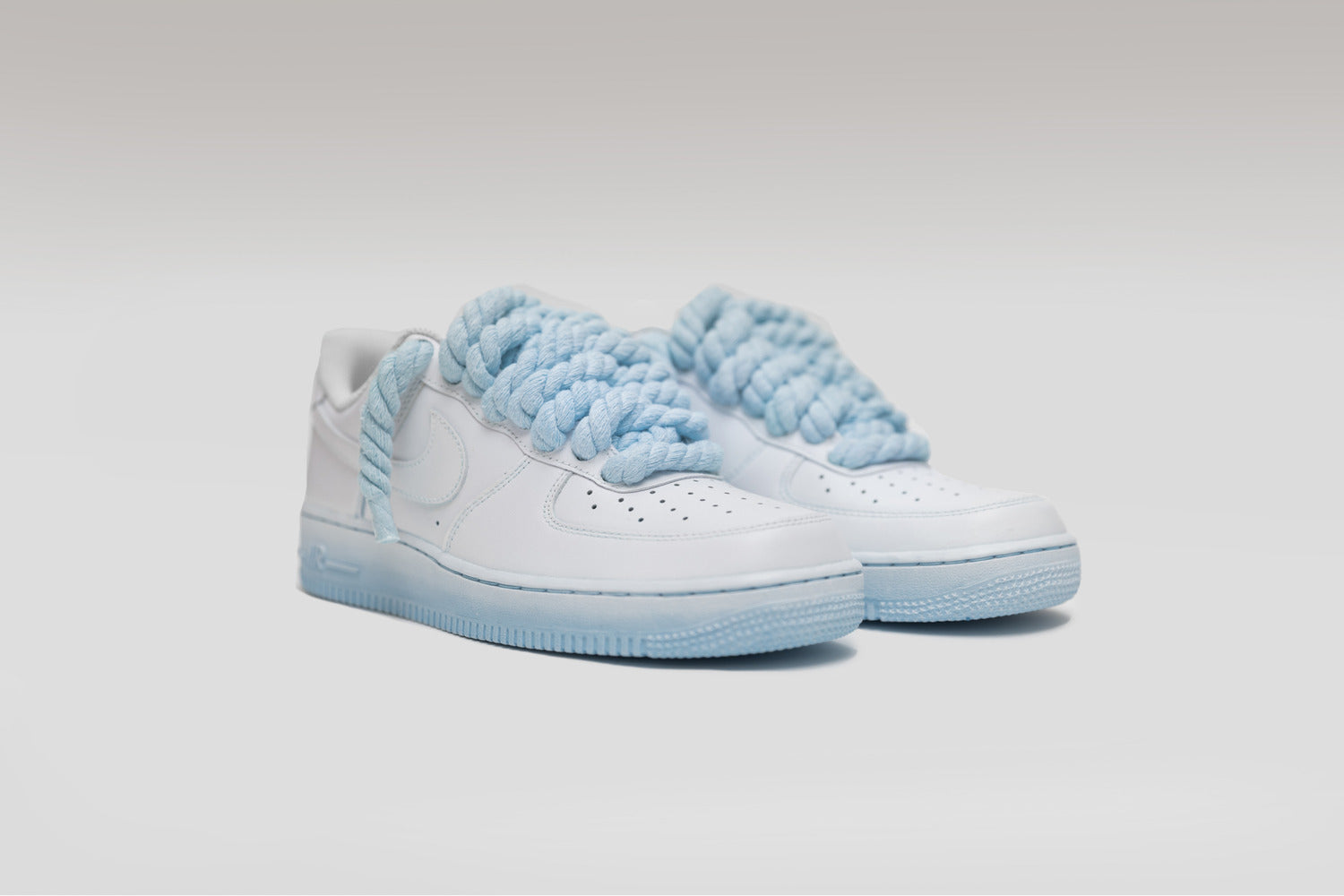 Cloud Drift transforms white Air Force sneakers with a baby blue dyed sole that fades gently like wisps of clouds. The harmonious match with baby blue laces enhances their ethereal appeal, making them a standout piece for those who appreciate understated yet distinctive style.